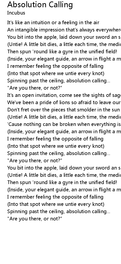 Spinning past the ceiling, absolution calling... |