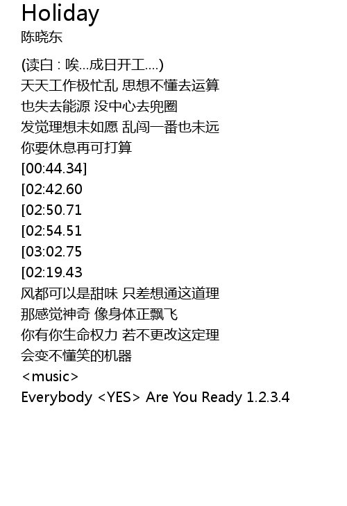| [03:07.12][02:42.60][01:51.71][00:45.85] | Everybody needs a holiday ye qing ni |