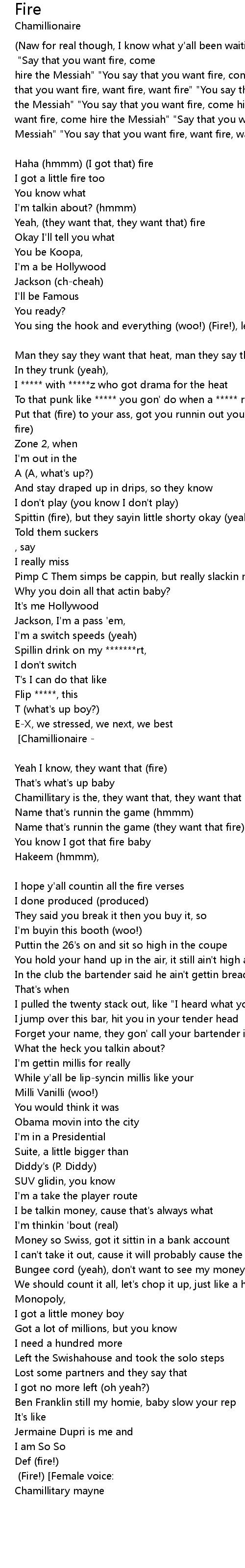 (Naw for real though, I know what y'all been waitin for) (Don't trip, I got it) (Fire!) [Chorus - Chamillionaire - w/ ad libs] "Say that you want fire, come hire the Messiah" "You say that you want fire, come hire the Messiah" "You say that you want fire, want fire, want fire" "You say that you want fire, come hire the Messiah" "You say that you want fire, come hire the Messiah" "Say that you want fire, come hire the Messiah" "Say that you want fire, come hire the Messiah" "You say that you want fire, want fire, want fire" [Chamillionaire - talking behind Chorus] |