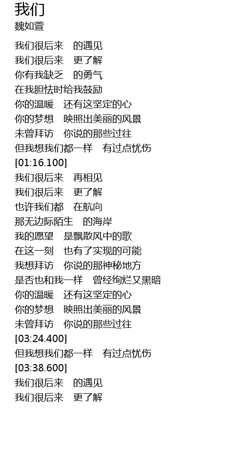 | [00:19.620] | wǒ men hěn hòu lái de yù jiàn |