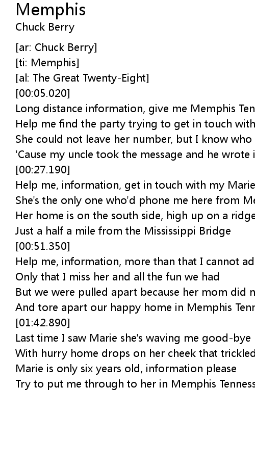 [00:05.760] Long distance information, give me Memphis Tennessee