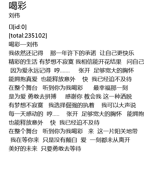 | [01:32.193] | zai zheng ge wu tai ting dao ni wei wo he cai zui xing fu na yi ke shi wei ai yong gan qu pin bo gan xie ni jiao hui wo zhe yi zhong sa tuo you meng xiang bu ji mo wo xuan ze jue jiang de zhi zhuo wo ke yi da sheng shuo mei yi tian gan dong de heng..... zhang kai zu gou kuan da de xiong huai neng yong bao zhen ai ye neng shi fang yi wai kuai wo yi jing po bu ji dai |