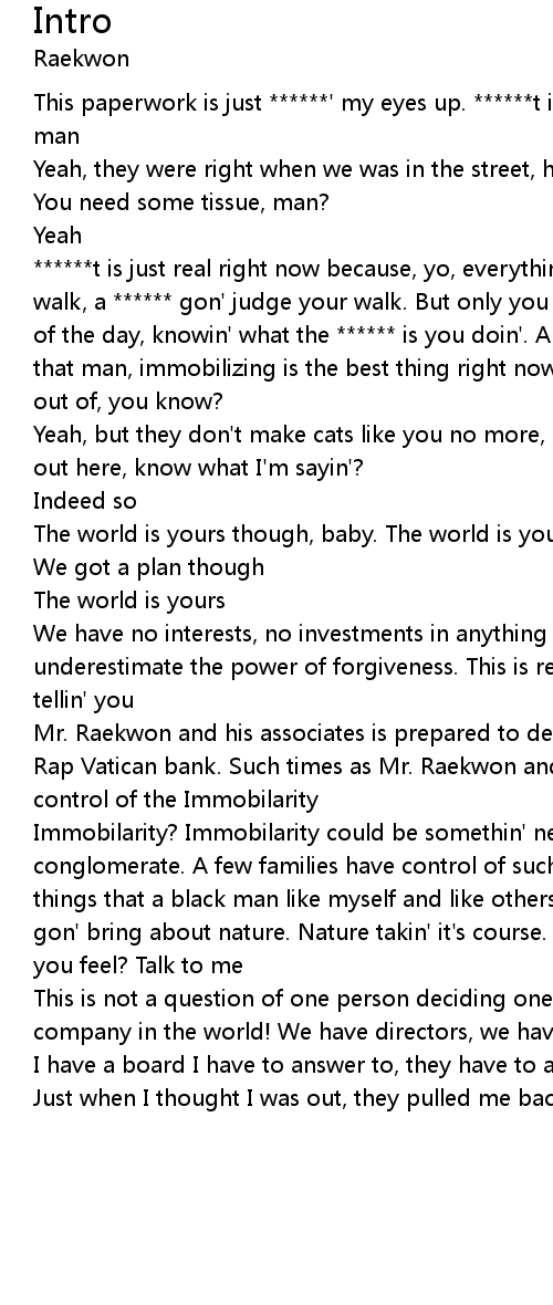 Mr. Raekwon and his associates is prepared to deposit 500 million dollars in the Rap Vatican bank. Such times as Mr. Raekwon and his associates receive majority control of the Immobilarity |