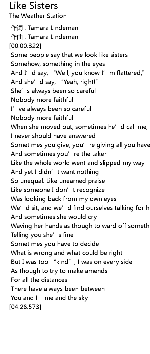 | [00:17.017] | Some people say that we look like sisters |