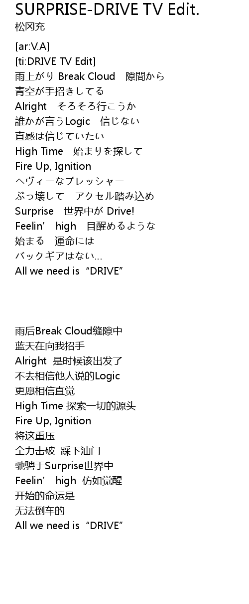 | [00:43.49] | Surprise 世界中が Drive! |