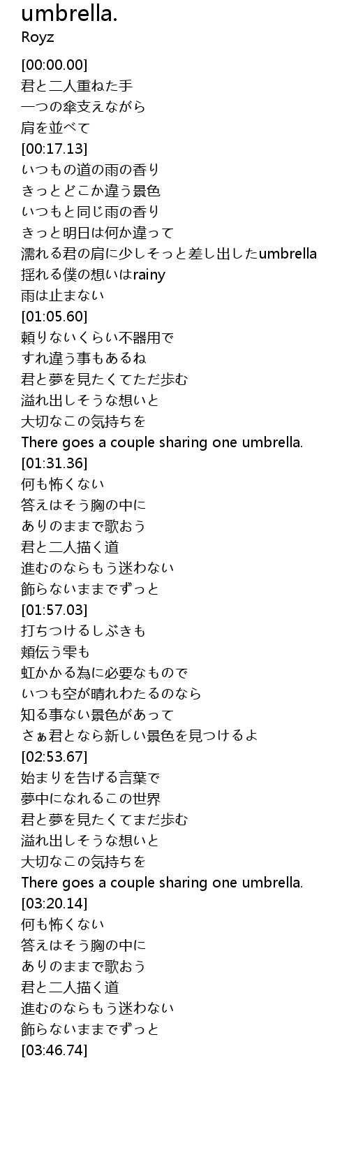 | [00:54.18] | 濡れる君の肩に少しそっと差し出したumbrella |