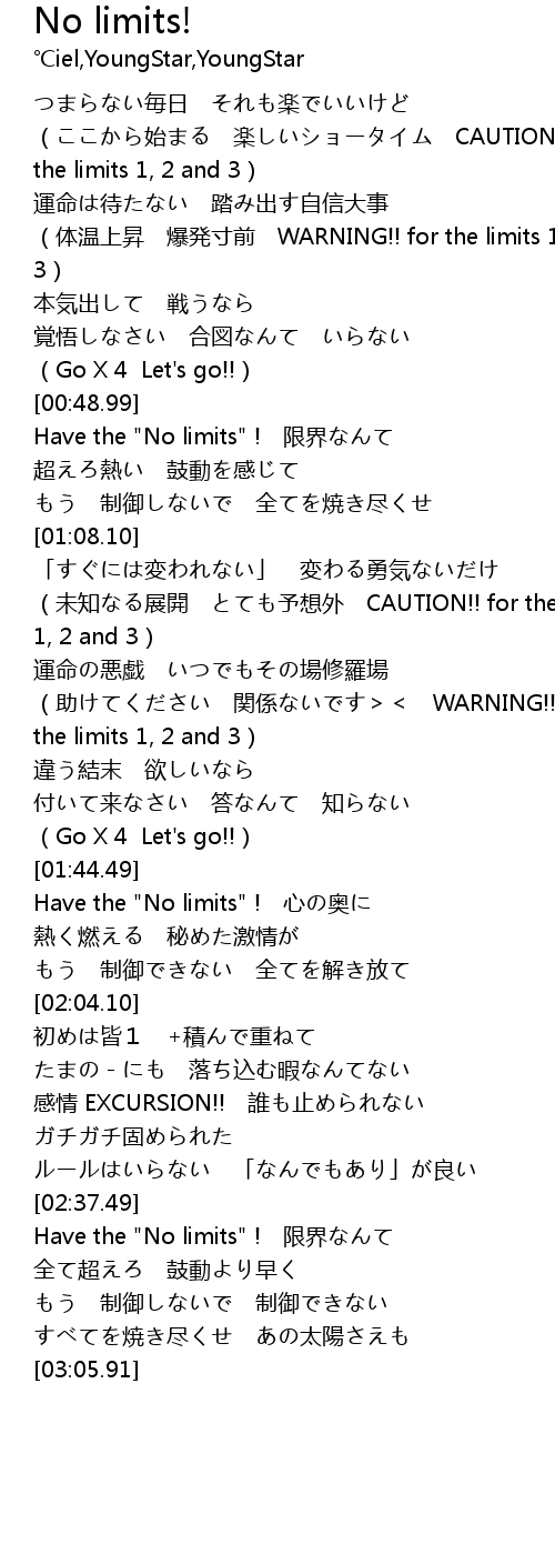 | [00:49.16] | Have the "No limits" ! 限界なんて |