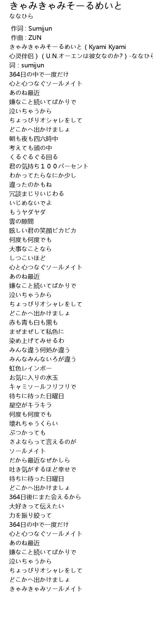 | [00:00.365] | きゃみきゃみそーるめいと(Kyami Kyami 心灵伴侣)(U.N.オーエンは彼女なのか?)-ななひら |