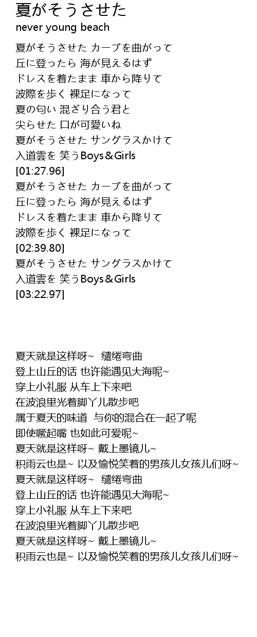 | [01:48.85] | 夏がそうさせた カーブを曲がって |