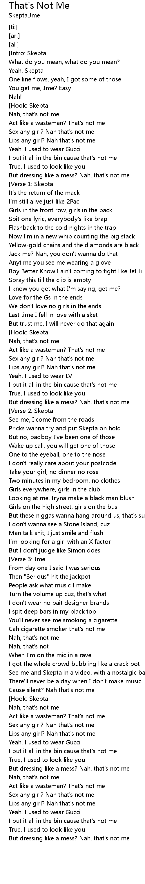 | [00:33.12] | Lips any girl? Nah that's not me |