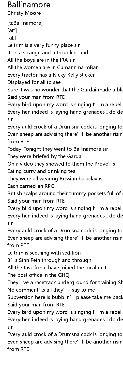 | [02:06.05] | Every auld crock of a Drumsna cock is longing to be free |