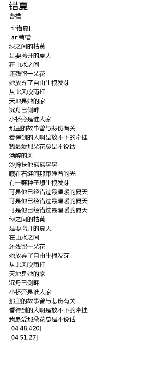 | [03:04.942] | kě shì tā yǐ jīng cuò guò zuì wēn nuǎn de xià tiān |