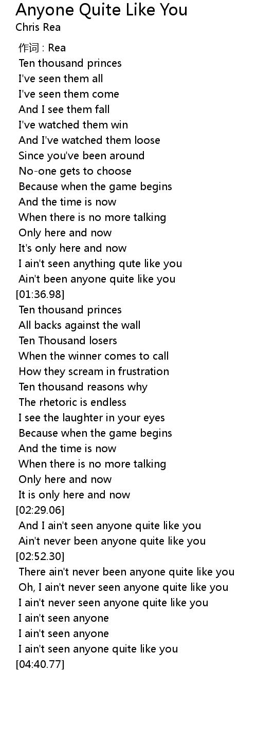 | [01:28.15] | Ain' t been anyone quite like you |