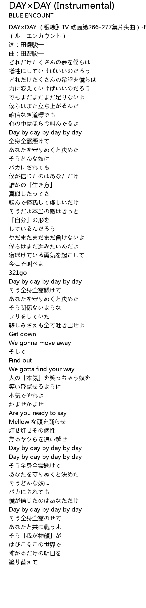 | [00:00.00] | DAY×DAY (银魂》TV 动画第266-277集片头曲)-BLUE ENCOUNT (ルーエンカウント) |