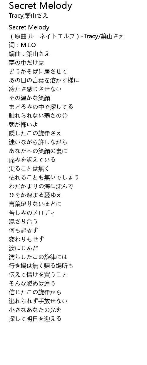| [00:00.194] | Secret Melody (原曲:ルーネイトエルフ)-Tracy/築山さえ |
