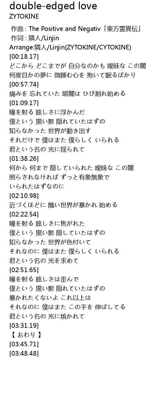 | [00:09.71] | Arrange:隣人/Linjin(ZYTOKINE/CYTOKINE) |