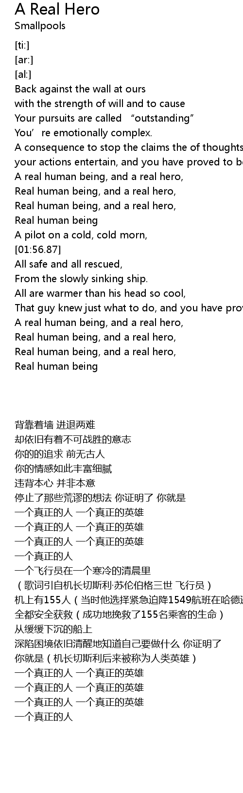 | [01:02.99] | 一个真正的人 一个真正的英雄 |