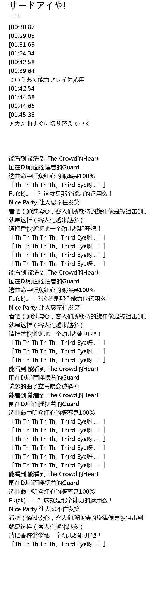 | [00:31.53][00:42.58][01:04.34][01:15.68][01:26.74][01:48.83][01:59.90][02:10.82][02:59.26][03:10.60][03:21.64][03:43.86][03:54.81][04:05.82][04:27.87] | 「サササササ、サードアイや…!」 |