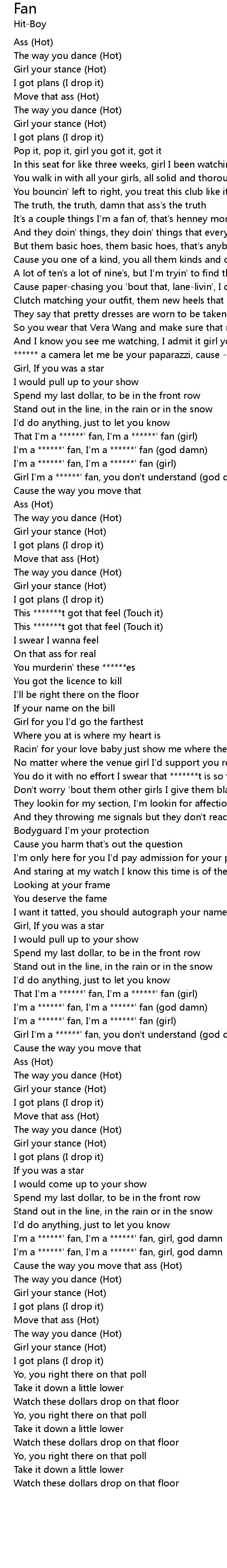 | I'm a ******' fan, I'm a ******' fan, girl, god damn | |