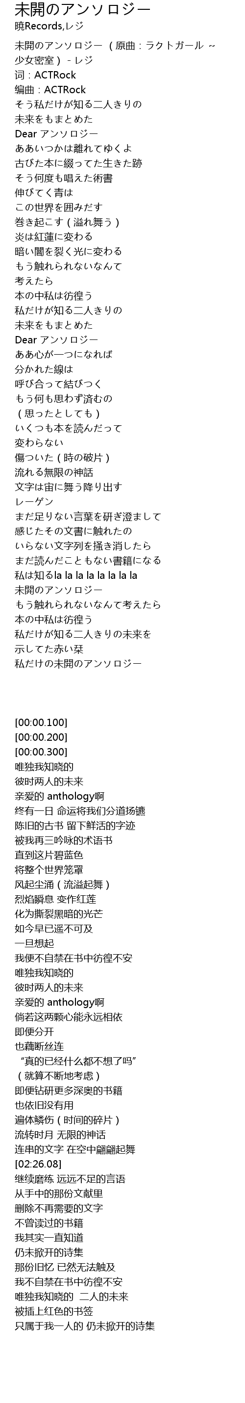 | [00:00.100] | 未開のアンソロジー (原曲:ラクトガール ~ 少女密室) - レジ |