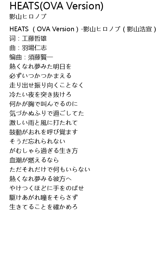 | [00:00.413] | HEATS (OVA Version)-影山ヒロノブ(影山浩宣) |