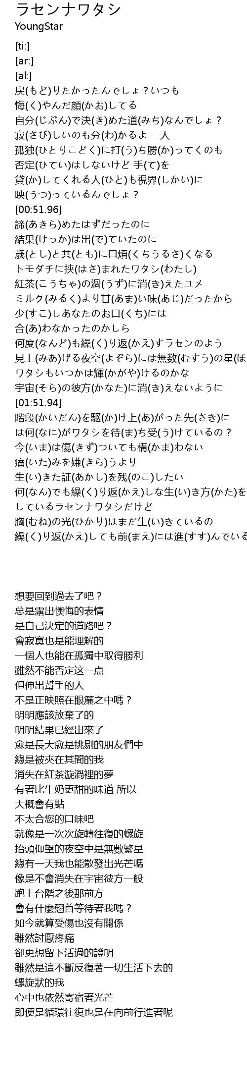 | [01:34.95] | 見上(みあ)げる夜空(よぞら)には無数(むすう)の星(ほし) |