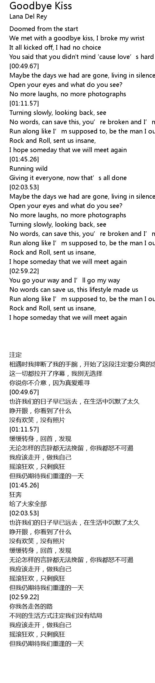 | [00:26.51] | We met with a goodbye kiss, I broke my wrist |