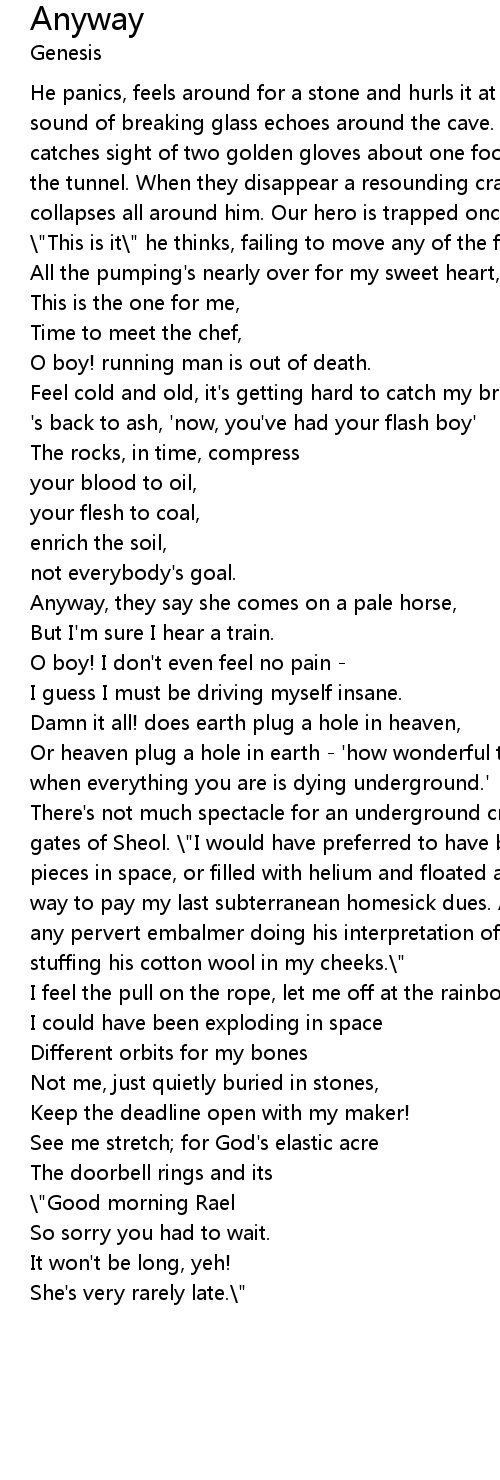 There's not much spectacle for an underground creole as he walks through the gates of Sheol. \"I would have preferred to have been jettisoned into a thousand pieces in space, or filled with helium and floated above a mausoleum. This is no way to pay my last subterranean homesick dues. Anyway I'm out of the hands of any pervert embalmer doing his interpretation of what I should look like, stuffing his cotton wool in my cheeks.\" |