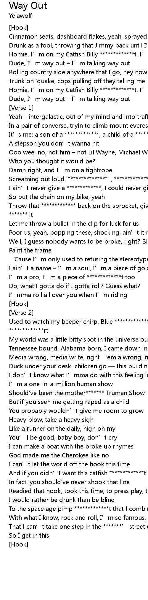 | Homie, I’m on my Catfish Billy *************t, I’m talking way out | |