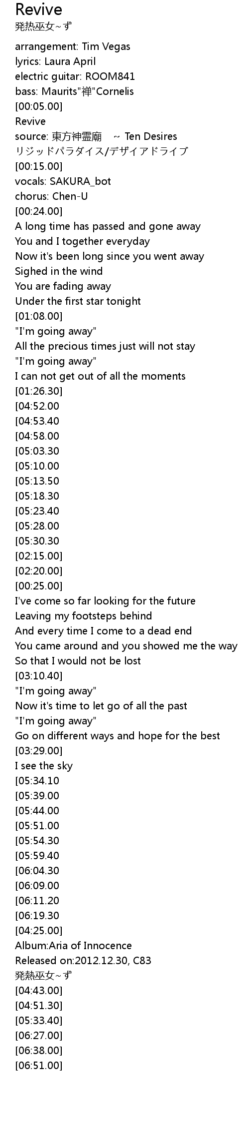 | [03:31.50][05:34.10] | Breathing in and breathing out |