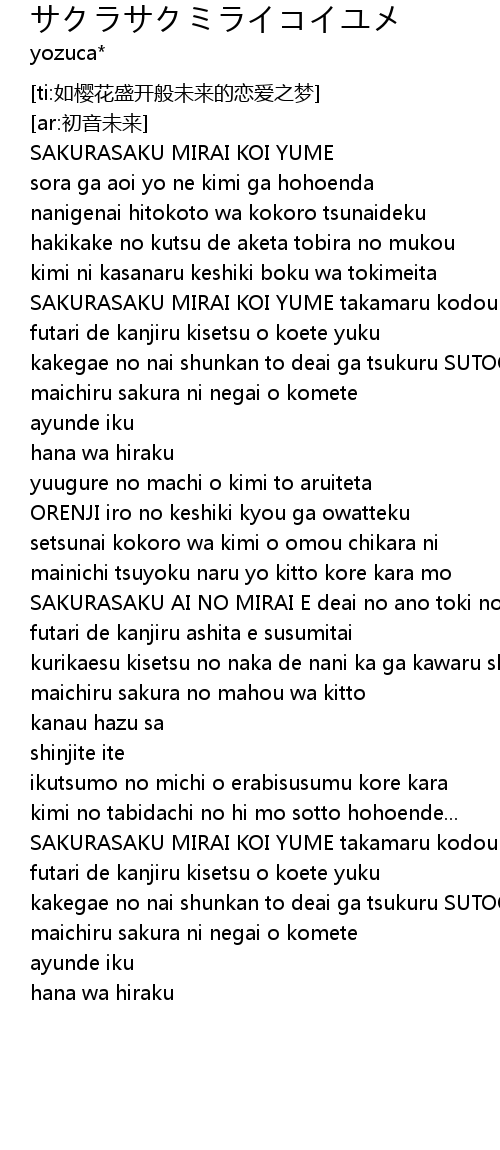 | [00:01.80] | SAKURASAKU MIRAI KOI YUME |