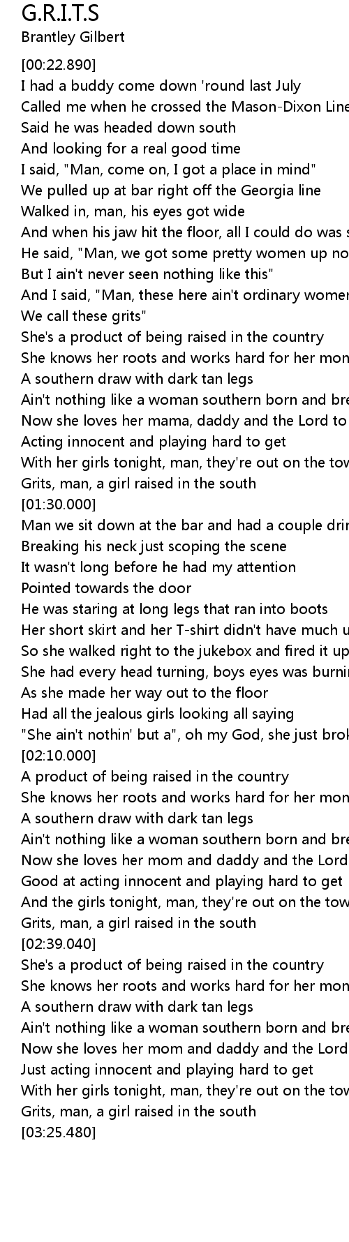 [01:23.000] Grits, man, a girl raised in the south