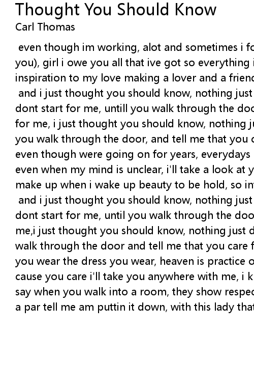 [Verse 1:] even though im working, alot and sometimes i forget to tell you (tell you), girl i owe you all that ive got so everything i have is yours, you're my inspiration to my love making a lover and a friend, the woman that i turn to time and time again [Hook: ] and i just thought you should know, nothing just dont start for me, untill you walk through the door and tell me that you care for me, i just thought you should know, nothing just dont start for me, untill you walk through the door, and tell me that you care for me.(yea) [Verse 2:] even though were going on for years, everydays a new day with you (with you), even when my mind is unclear, i'll take a look at you and smile even without make up when i wake up beauty to be hold, so intellegent and confident you've got soo much soul [Hook: X2] and i just thought you should know, nothing just dont start for me, until you walk through the door and tell me that you care for me,i just thought you should know, nothing just dont start for me, until you walk through the door and tell me that you care for me ooh is what i say when you wear the dress you wear, heaven is practice on the table, girl am happy cause you care i'll take you anywhere with me, i know they go ahh is what they say when you walk into a room, they show respect cause am with you, they give me a par tell me am puttin it down, with this lady that i've found |