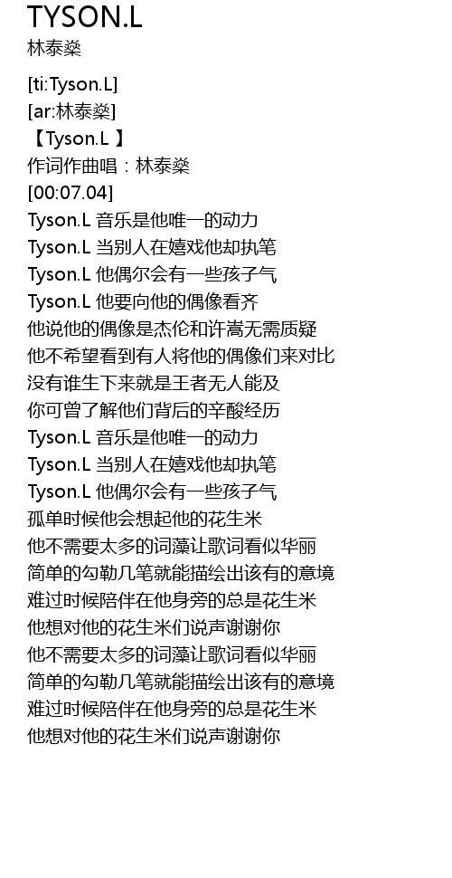 | [00:16.33] | Tyson.L 音乐是他唯一的动力 |