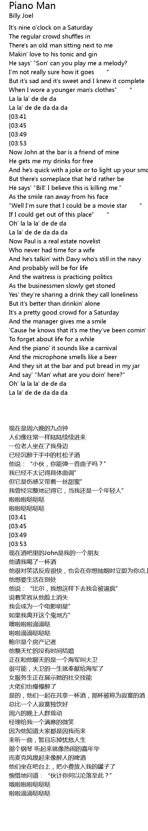 | [04:57][03:41][01:26] | Sing us a song' you' re the piano man |