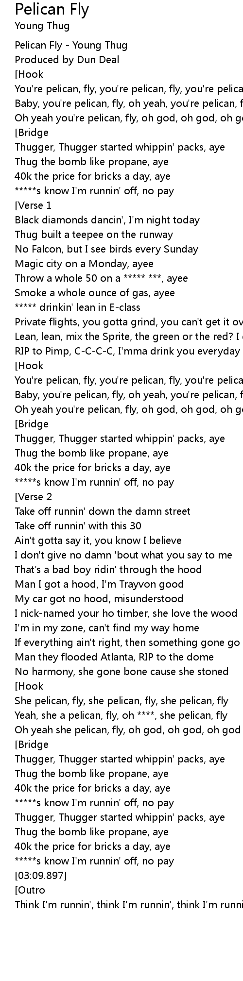 [02:32.699] Yeah, she a pelican, fly, oh ****, she pelican, fly