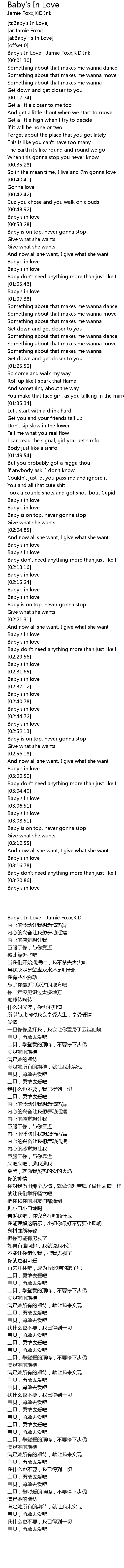 | [00:00.12] | Baby's In Love - Jamie Foxx,KiD Ink |