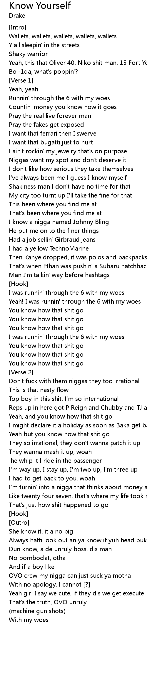 Runnin' through the 6 with my woes |
