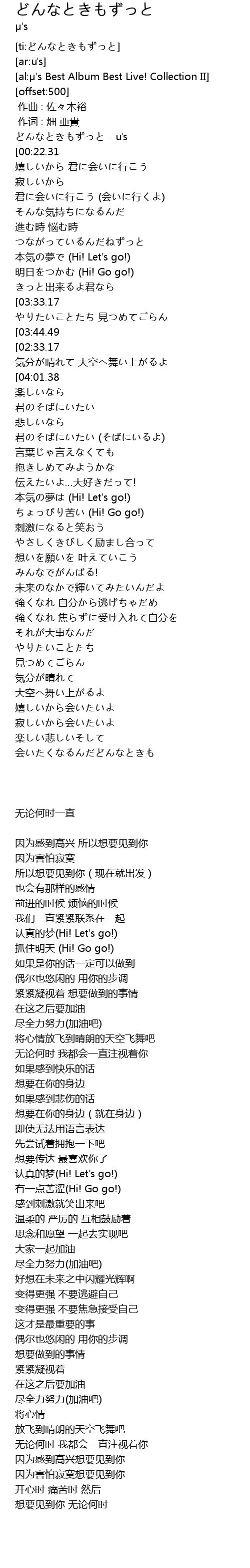 | [00:00.72] | どんなときもずっと - u's |