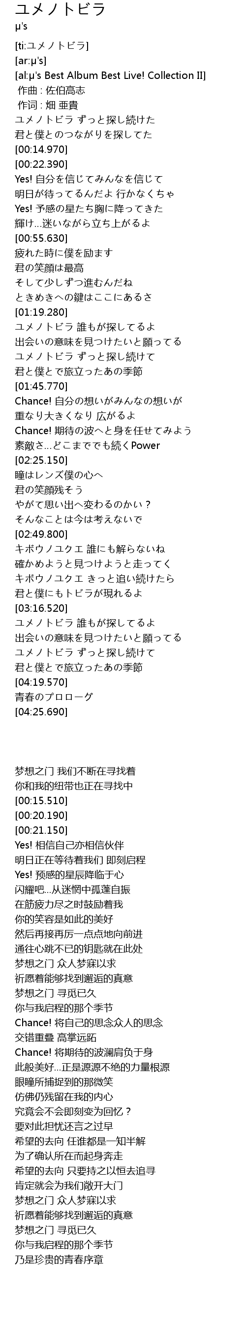 | [01:33.910] | ユメノトビラ ずっと探し続けて |