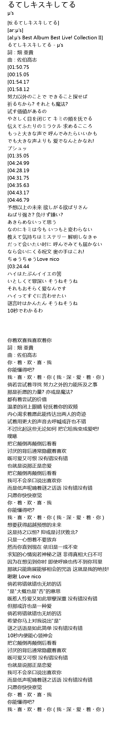 | [00:09.31][01:58.12][04:58.47] | ス・キ・し・て・る(あ・い・し・て・る) |