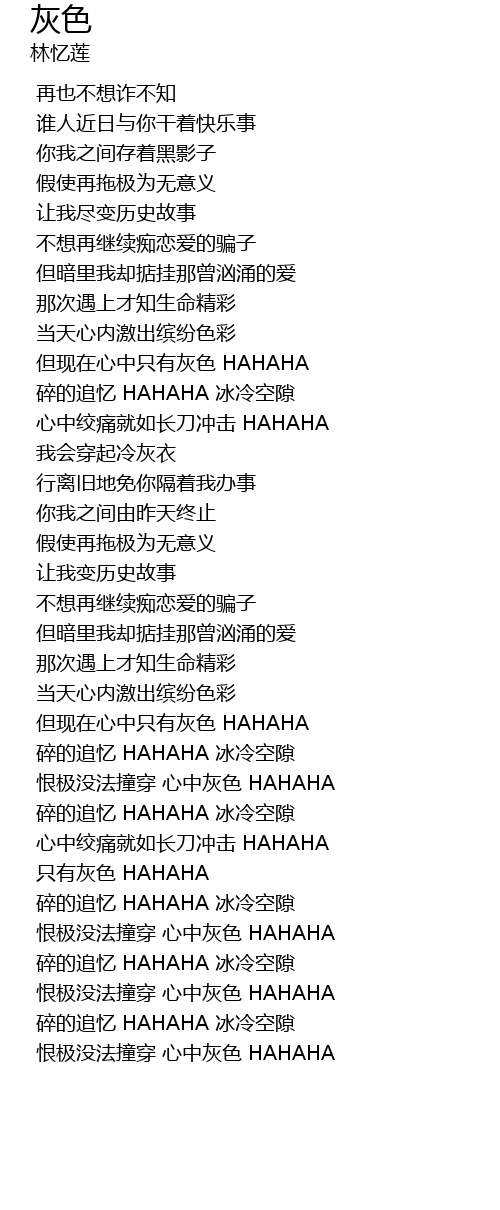 | [03:25.0] | 恨极没法撞穿 心中灰色 HAHAHA |