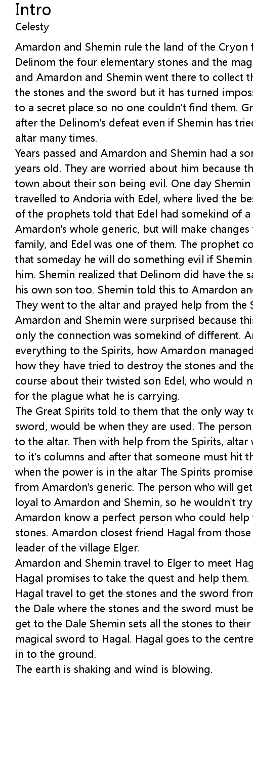 Years passed and Amardon and Shemin had a son, and named him Edel, now Edel is 8 years old. They are worried about him because there is strange rumors in the town about their son being evil. One day Shemin got enough about the rumors and travelled to Andoria with Edel, where lived the best prophets of the Cryon. One of the prophets told that Edel had somekind of a plague which has infected the Amardon's whole generic, but will make changes to only few of the men in the family, and Edel was one of them. The prophet couldn't help Edel but was sure that someday he will do something evil if Shemin couldn't find the way to cure him. Shemin realized that Delinom did have the same plague that was now infected his own son too. Shemin told this to Amardon and they both travelled to Andoria. They went to the altar and prayed help from the Spirits.