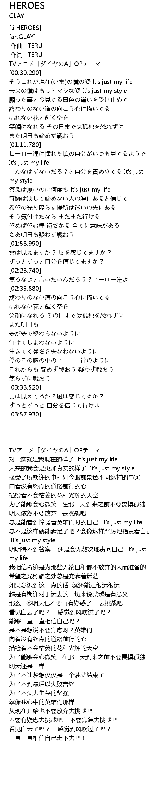 | [01:14.510] | ヒーロー達に憧れた頃の自分がいつも見てるようで It's just my life |