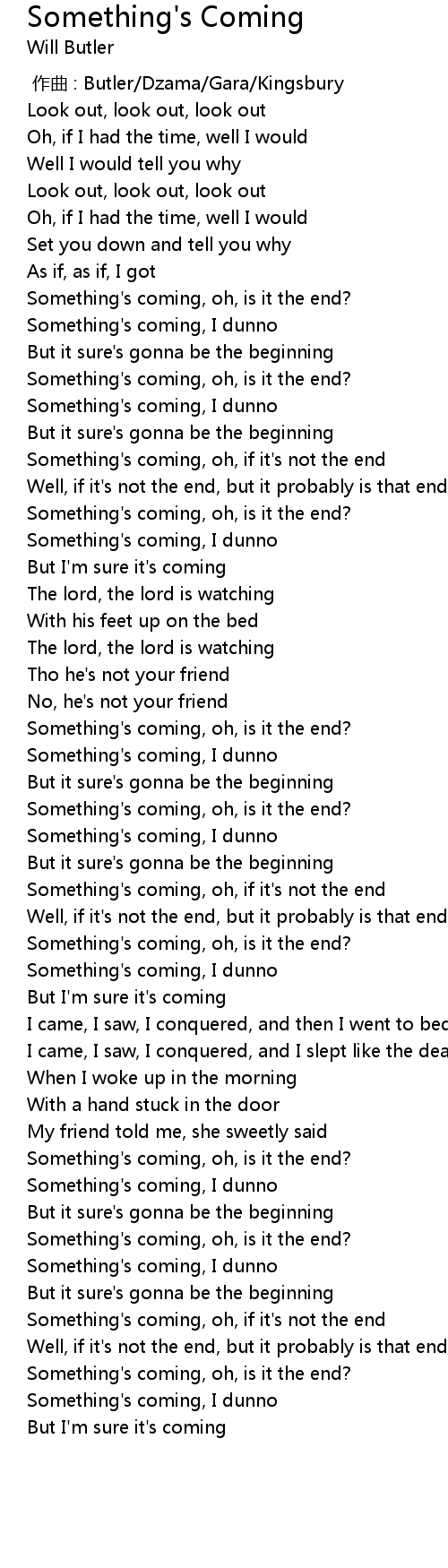 | [01:02.000] | Something' s coming, oh, is it the end? |