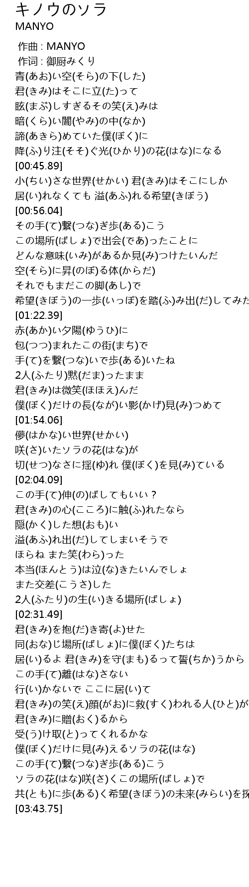 | [03:29.18] | ソラの花(はな)咲(さ)くこの場所(ばしょ)で |