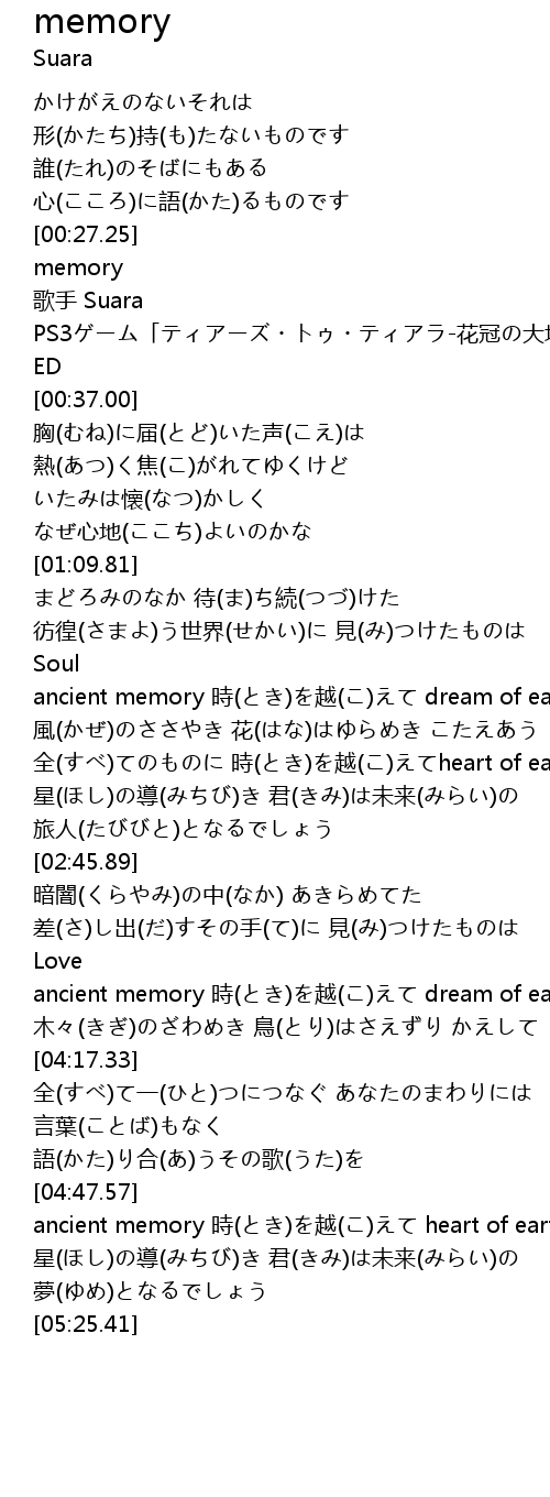 | [03:48.62] | ancient memory 時(とき)を越(こ)えて dream of earth |