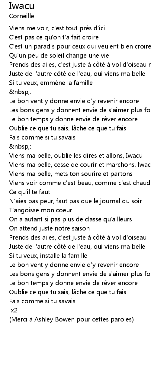 | Viens ma belle, oublie les dires et allons, Iwacu | |