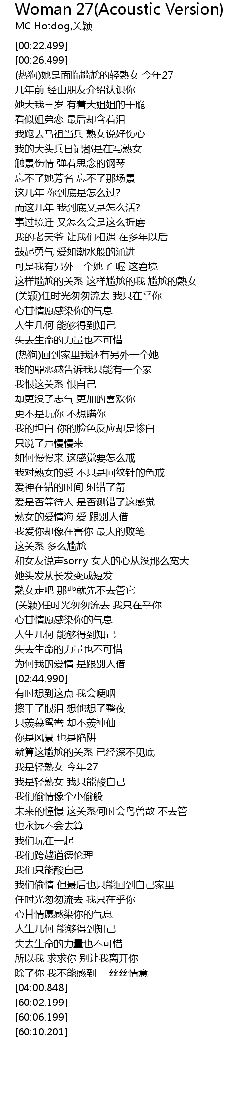 | [00:29.390] | (热狗)她是面临尴尬的轻熟女 今年27 |