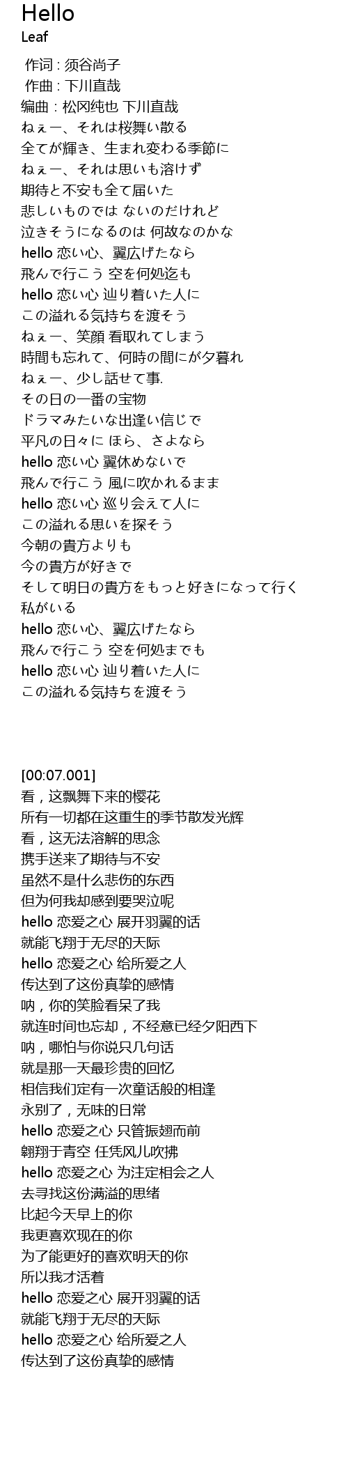 | [02:17.021] | hello 恋い心 翼休めないで |